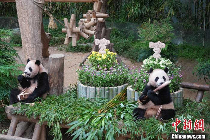 中新社韓國(guó)龍仁7月7日電 (記者 劉旭)在韓國(guó)誕生的雌性大熊貓雙胞胎“睿寶”和“輝寶”7日迎來(lái)兩周歲生日。韓國(guó)愛寶樂園為它們舉辦慶生活動(dòng)。