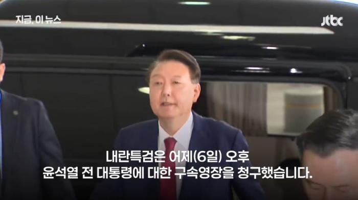 尹錫悅到案接受內(nèi)亂特檢調(diào)查。圖片來源:韓媒JTBC報道截圖