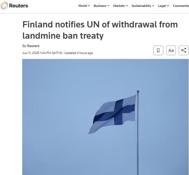 中新網(wǎng)7月11日電 據(jù)路透社報(bào)道,當(dāng)?shù)貢r(shí)間10日晚,芬蘭外交部發(fā)表聲明稱,該國已通知聯(lián)合國,將退出《渥太華禁雷公約》。