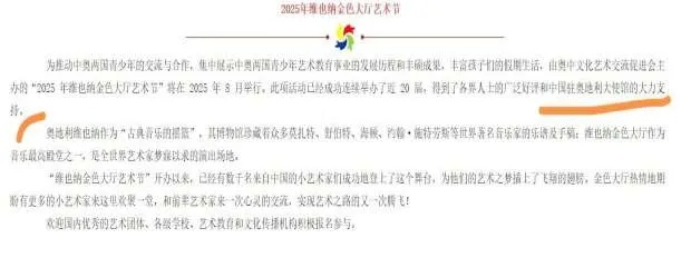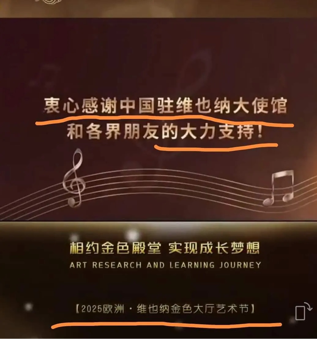 央視網(wǎng)消息:據(jù)中國駐奧地利使館微信公眾號(hào)消息,近日,抖音和網(wǎng)絡(luò)上出現(xiàn)某“金色大廳藝術(shù)節(jié)”相關(guān)信息,聲稱“衷心感謝中國駐維也納大使館和各界朋友的大力支持!”中國駐奧地利使館對此鄭重聲明,對該活動(dòng)不知情,未以任何形式參與,并保留追究相關(guān)責(zé)任的權(quán)利。