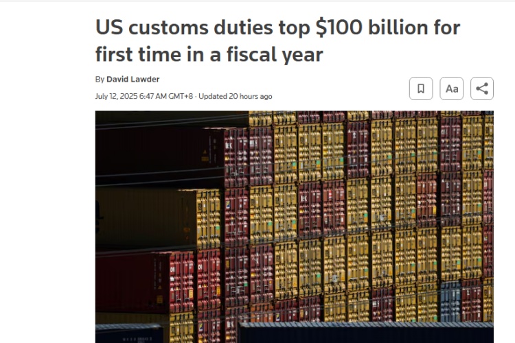 數(shù)據(jù)顯示,6月美國海關(guān)關(guān)稅總額高達約270億美元,較去年同期暴增301%,這使得美國單一財年內(nèi)關(guān)稅收入累積金額首次突破1000億美元。