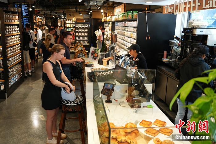 當(dāng)?shù)貢r(shí)間7月15日,美國(guó)紐約曼哈頓一家超市顧客購(gòu)買食物。 中新社記者 廖攀 攝
