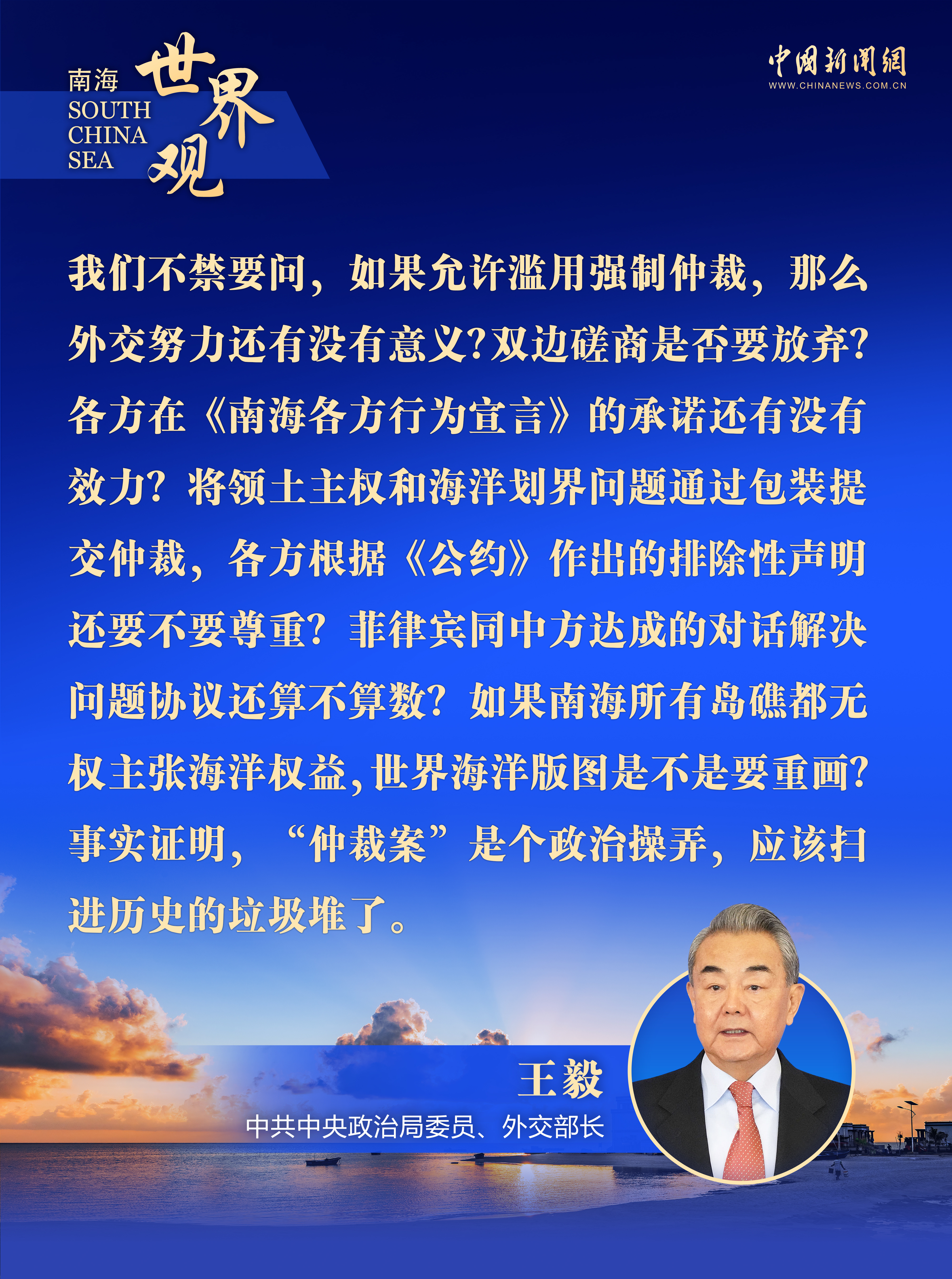 談及2016年菲律賓單方面提起的所謂“南海仲裁案”,王毅表示,相關(guān)“裁決”在事實(shí)認(rèn)定和法律適用等方面都存在嚴(yán)重缺陷,是打著《聯(lián)合國(guó)海洋法公約》旗號(hào)做違反《公約》的事情,對(duì)地區(qū)和平穩(wěn)定和國(guó)家海洋秩序帶來(lái)的破壞越來(lái)越明顯。