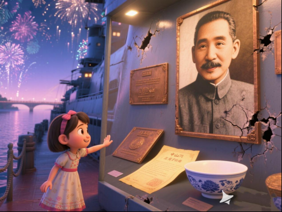 中山艦的修復(fù)與重生,象征著歷史傷痕的愈合與精神血脈的賡續(xù)。1997年整體打撈,如打撈起一段沉沒的民族記憶。修復(fù)者們以敬畏之心撫平鋼鐵創(chuàng)傷,還原其歷史原貌,使其成為“移動的教科書”。今日艦上陳列的長方形銅牌、青花瓷碗、泛黃收報單,這些出水文物皆如時光之窗,使歷史可觸可感。