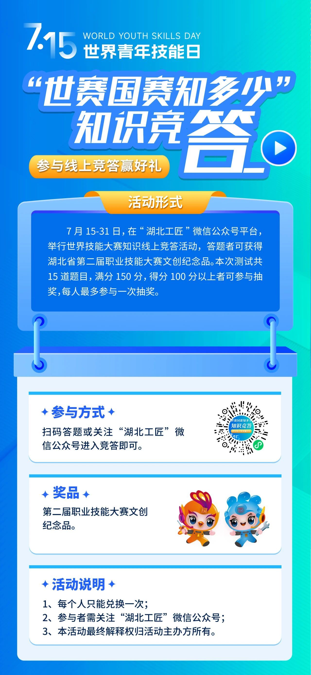世界技能大賽和全國技能大賽知識線上競答火熱上線,微信掃描活動二維碼進(jìn)入答題小程序。完成15道題并得分≥100分,即可抽取湖北省第二屆職業(yè)技能大賽限量版文創(chuàng)紀(jì)念品,每人限答一次,越早參與中獎率越高!