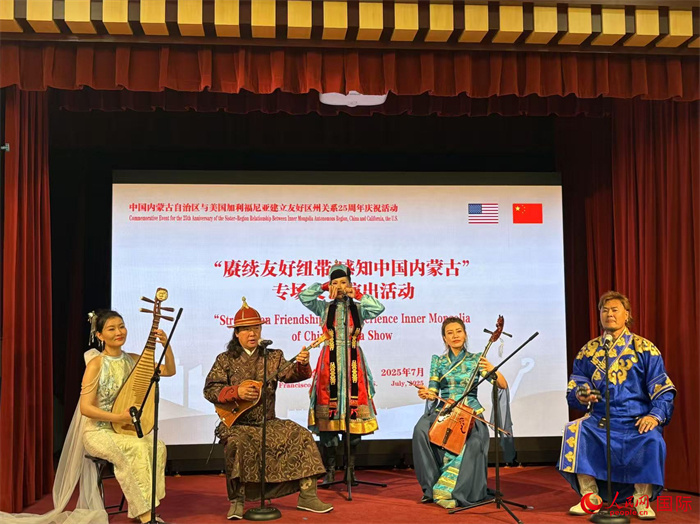 人民網(wǎng)舊金山7月18日電 (記者鄧圩)馬頭琴聲聲,口弦琴悠揚,琵琶曲纏綿,蒙古族贊歌、悠遠的情歌點燃舊金山的熱情。中國駐舊金山總領(lǐng)館禮堂中,熱烈而歡騰的掌聲一陣又一陣。當(dāng)?shù)貢r間7月18日,紀(jì)念內(nèi)蒙古自治區(qū)與加州建立友好區(qū)州關(guān)系25周年慶?;顒訉鑫乃囇莩鲈诖伺e行,來自中美兩國的政商、文化界及友好人士齊聚一堂,舊雨新知共話中美省州友好情誼。
