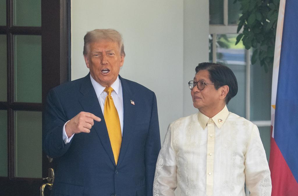 7月22日,美國(guó)總統(tǒng)特朗普(左)在華盛頓白宮歡迎到訪的菲律賓總統(tǒng)馬科斯。新華社記者 胡友松 攝