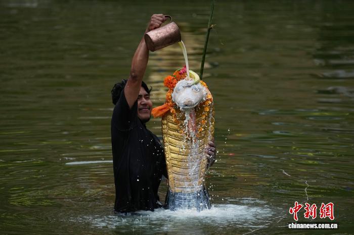 7月29日,尼泊爾加德滿都谷地巴德崗古城,當?shù)厍嗄臧徒芾槔飦唽⑴D痰瓜蛏呱袷?,慶祝蛇神節(jié)。中新社記者 崔楠 攝