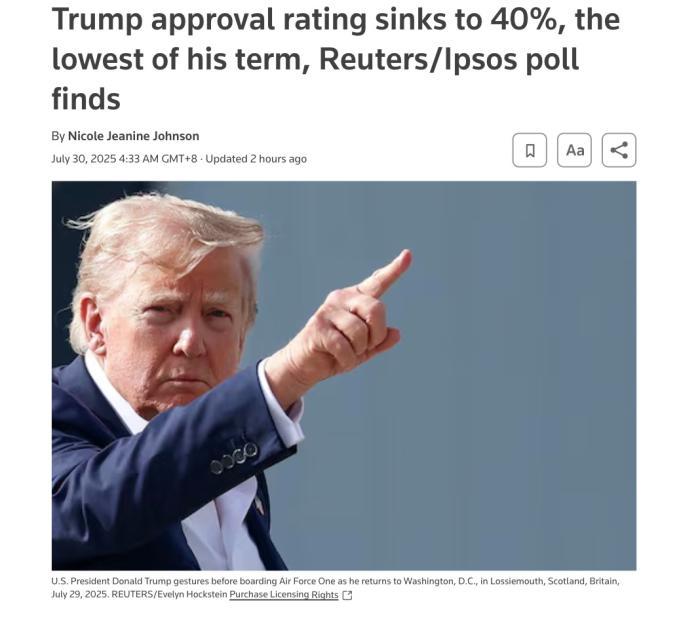 中新網(wǎng)7月30日電 據(jù)路透社報(bào)道,當(dāng)?shù)貢r(shí)間29日,路透社和益普索民調(diào)顯示,美國(guó)總統(tǒng)特朗普的支持率下降一個(gè)百分點(diǎn)至40%,為其第二任期內(nèi)新低。