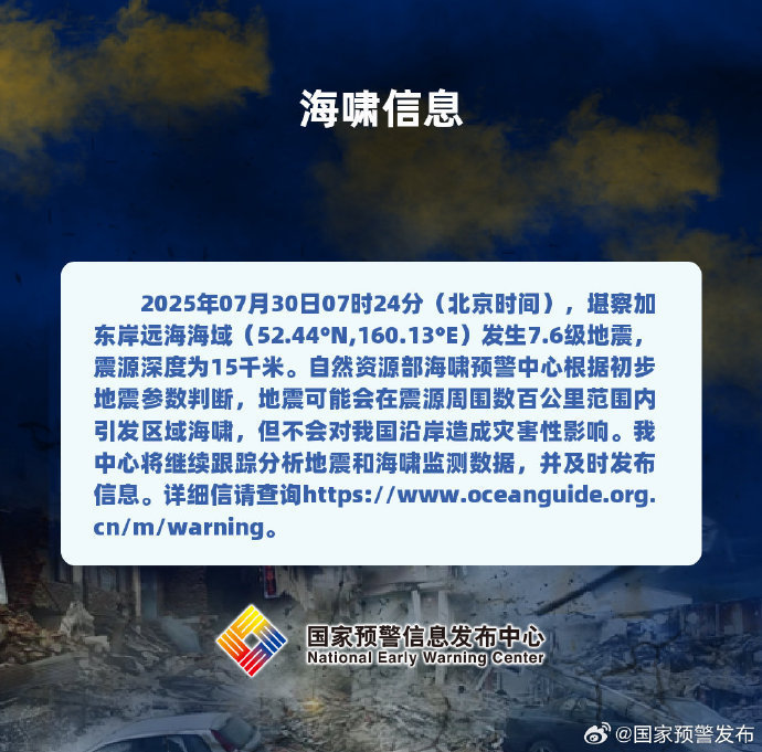央視網(wǎng)消息:國家海洋預(yù)報(bào)臺發(fā)布地震海嘯信息,07月30日07時(shí)24分(北京時(shí)間),堪察加?xùn)|岸遠(yuǎn)海海域(52.44°N,160.13°E)發(fā)生7.6級地震,震源深度為15千米。自然資源部海嘯預(yù)警中心根據(jù)初步地震參數(shù)判斷,地震可能會在震源周圍數(shù)百公里范圍內(nèi)引發(fā)區(qū)域海嘯,但不會對我國沿岸造成災(zāi)害性影響。