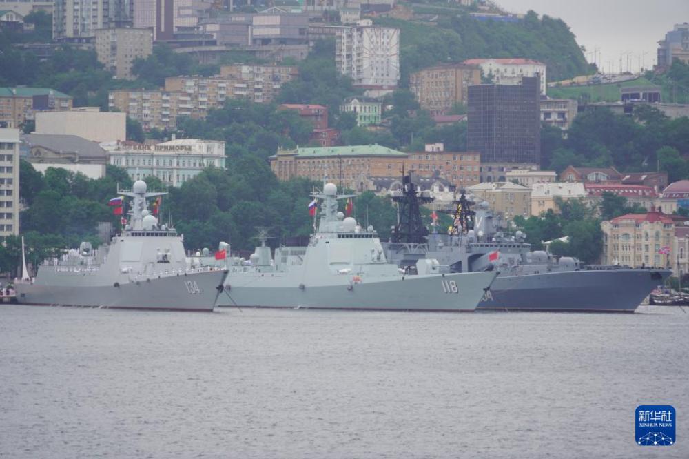 這是7月31日在俄羅斯符拉迪沃斯托克某軍港拍攝的參加中俄“海上聯(lián)合-2025”聯(lián)合演習的中俄雙方部分參演艦艇。