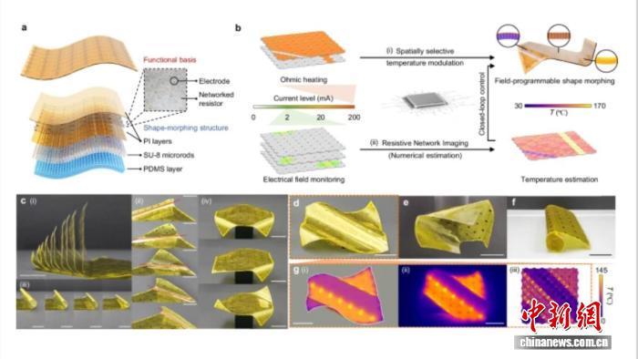 在本項(xiàng)研究中,論文共同通訊作者、韓國科學(xué)技術(shù)院Inkyu Park和Jung Kim與同事合作制作出一個(gè)機(jī)器人折疊薄片,使用密集分布的熱敏電元件構(gòu)成,受熱可改變形狀。他們用一張40平方厘米的薄片展示了這一方法,該薄片由308個(gè)兼具加熱器和感受器功能的電阻構(gòu)成。這種雙功能使之可以實(shí)現(xiàn)精確控制移動(dòng),系統(tǒng)可根據(jù)感受器反饋?zhàn)鞒龀掷m(xù)調(diào)整。
