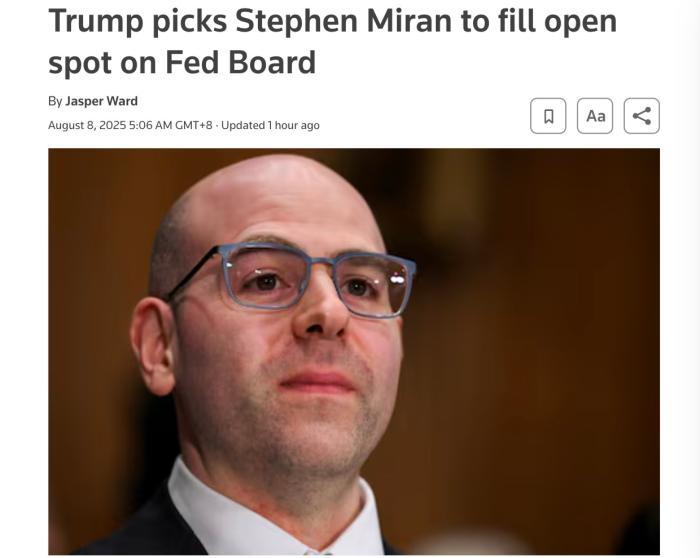 報道介紹,斯蒂芬·米蘭是現(xiàn)任白宮經(jīng)濟顧問委員會主席,擁有哈佛大學(xué)經(jīng)濟學(xué)專業(yè)的博士學(xué)位,曾在特朗普第一任總統(tǒng)任期內(nèi)擔任美國財政部經(jīng)濟政策高級顧問。
