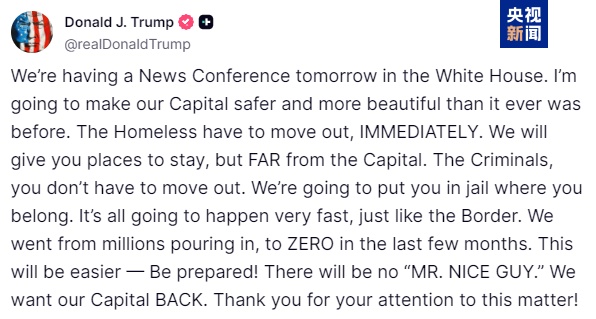 當?shù)貢r間8月10日,美國總統(tǒng)特朗普在其社交媒體“真實社交”上發(fā)文表示,將于次日在白宮舉行記者會,宣布一系列旨在讓首都“比以往更安全、更美麗”的措施。