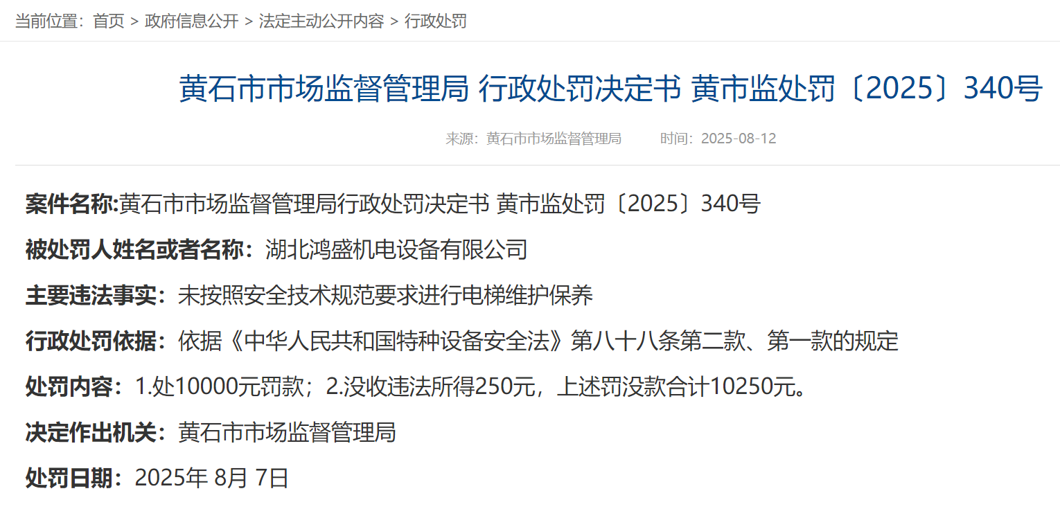 公告顯示,三家受處罰企業(yè)分別為湖北鴻盛機電設備有限公司、黃石市中信電梯工程有限公司和深圳市開元科創(chuàng)樓宇科技有限公司。主要違法事實均為“未按照安全技術規(guī)范要求進行電梯維護保養(yǎng)”。依據《中華人民共和國特種設備安全法》第八十八條第二款、第一款的規(guī)定,黃石市市場監(jiān)督管理局在統(tǒng)一作出處10000元罰款的同時,還分別對三家違法企業(yè)分別處以沒收違法所得250元、258.33元、282.27元。