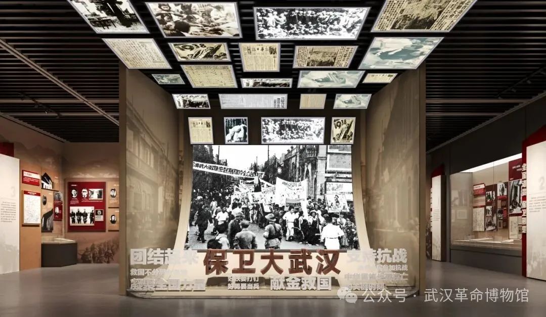 “保衛(wèi)大武漢”場景采用音頻+燈箱照片結(jié)合的方式,展示中國共產(chǎn)黨領(lǐng)導(dǎo)下的“以抗日救亡團(tuán)體為骨干,救亡書刊為導(dǎo)向,救亡活動為內(nèi)容”三位一體的抗日救亡活動,以武漢為中心,迅速席卷全國。