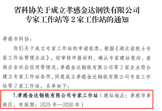荊楚網(wǎng)(湖北日報網(wǎng))訊(通訊員 陳娟)近日,湖北省科協(xié)公布了《省科協(xié)關于成立孝感金達鋼鐵有限公司專家工作站等2家工作站的通知》,孝感金達鋼鐵有限公司專家工作站正式獲批成立,為孝南區(qū)首家與外籍院士共建的專家工作站。