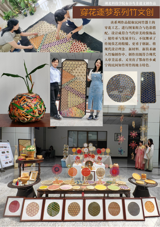 跨專業(yè)團(tuán)隊(duì)覆蓋設(shè)計(jì)、教育、傳播等領(lǐng)域,形成研發(fā)-推廣-銷售全鏈條。近年獲7項(xiàng)國家級/省級創(chuàng)業(yè)項(xiàng)目、17項(xiàng)專利、50余項(xiàng)學(xué)科競賽獎,2023年入選教育部傳統(tǒng)文化宣傳項(xiàng)目,2024年斬獲湖北省大學(xué)生藝術(shù)節(jié)二等獎并亮相開幕展演,現(xiàn)場打造的“湖科大藝圓”竹編裝置獲專家贊譽(yù)。