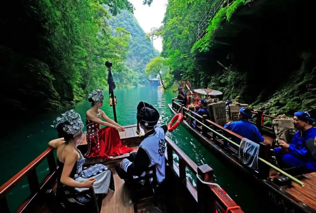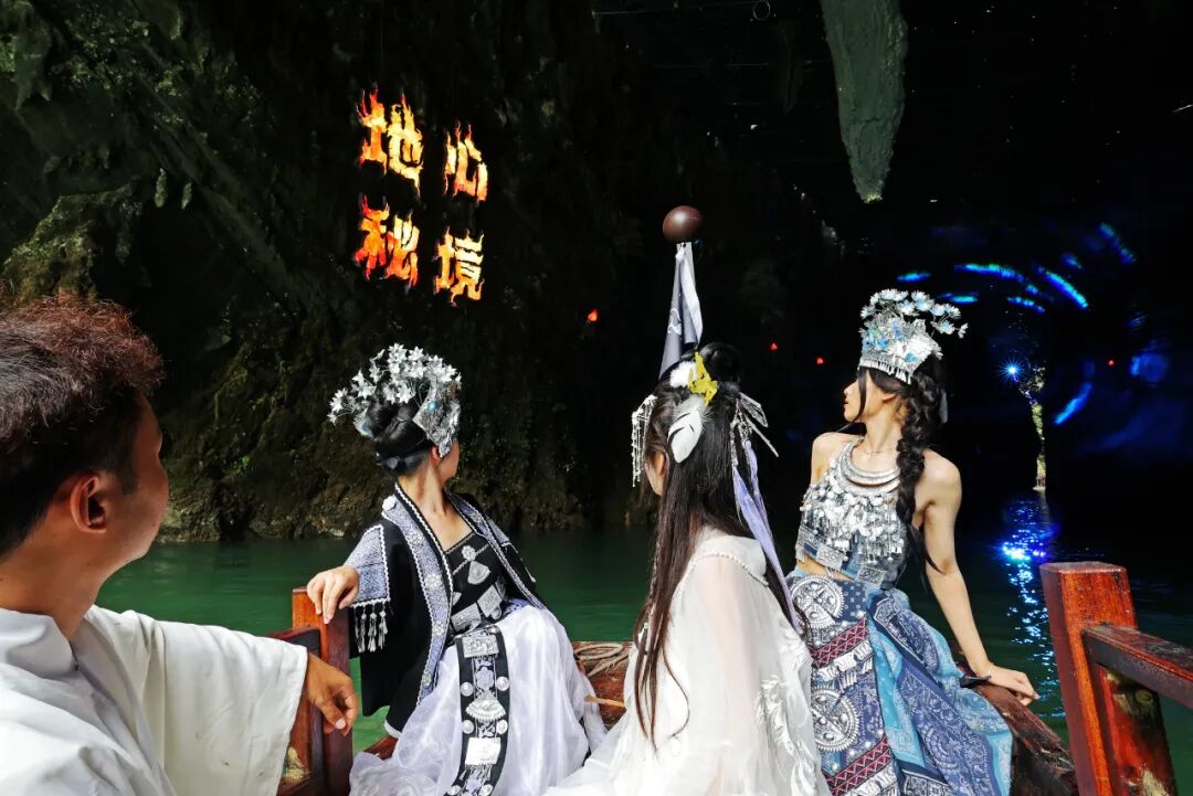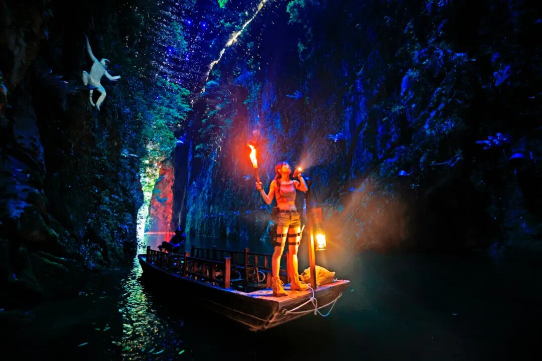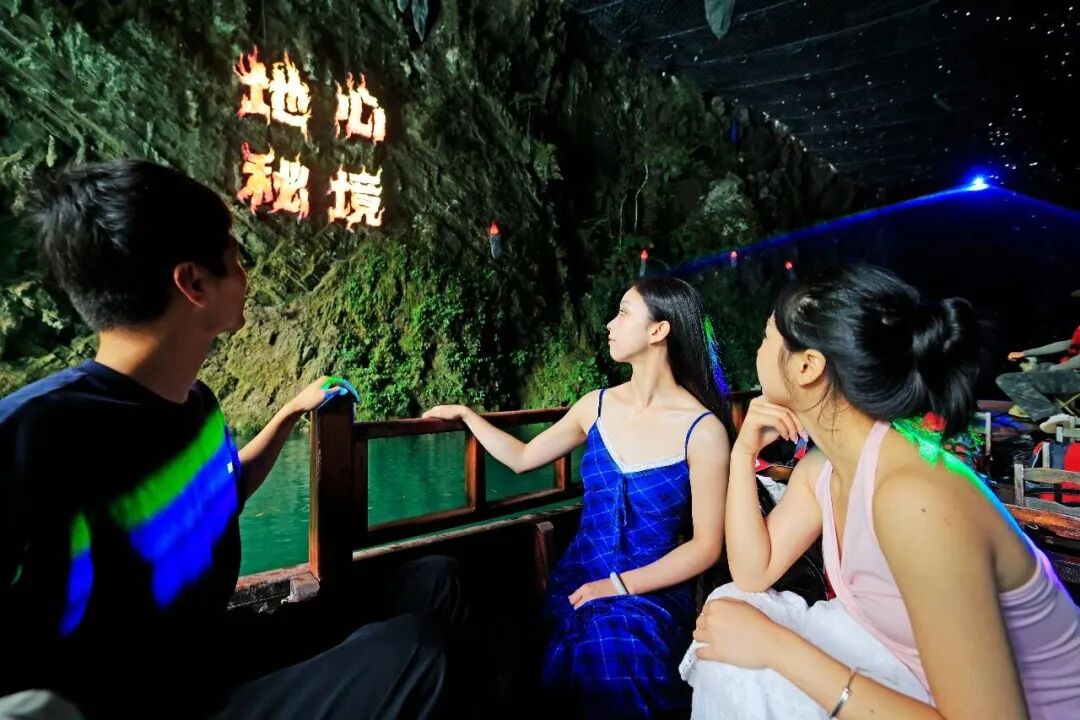 船只駛入幽深的地下河道,涼爽氣息撲面而來。七彩燈光投射在千年崖壁上,打造出如夢似幻的氛圍。在蜿蜒曲折的地下迷宮中穿行,每一次轉彎都可能遇見震撼的地質奇觀。