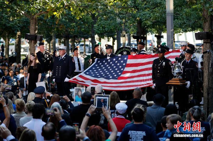 當(dāng)天上午8點(diǎn)40分許,由紐約市警察、消防員等組成的儀仗隊(duì)高舉美國國旗走上講臺(tái),一名17歲高中生唱響美國國歌,紀(jì)念儀式正式開始。8點(diǎn)46分,悼念的鐘聲響起,全場(chǎng)默哀。隨后,遇難者親屬代表登臺(tái),依次念出所有遇難者姓名。