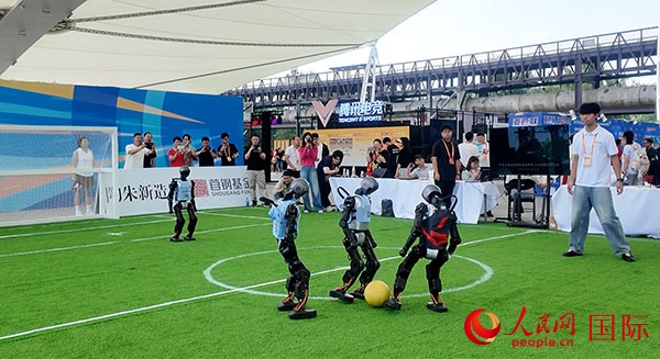 在服貿(mào)會體育服務展區(qū),機器人踢足球吸引觀眾駐足。人民網(wǎng)記者 吳凱攝