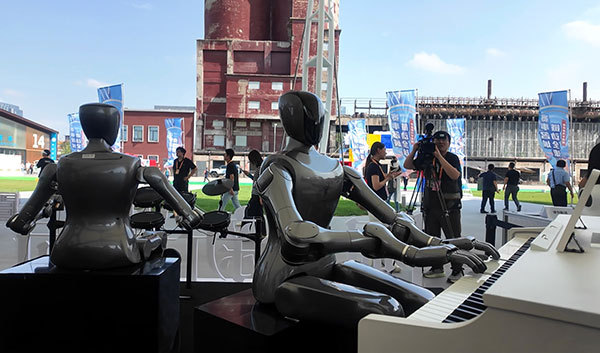 在服貿(mào)會體育服務展區(qū),機器人在彈鋼琴。人民網(wǎng)記者 吳凱攝
