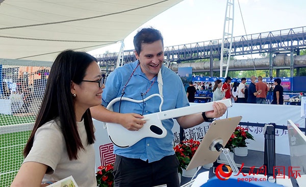 在服貿(mào)會體育服務展區(qū),觀眾體驗“陶朱新造局”帶來新材料制作的吉他。人民網(wǎng)記者 吳凱攝