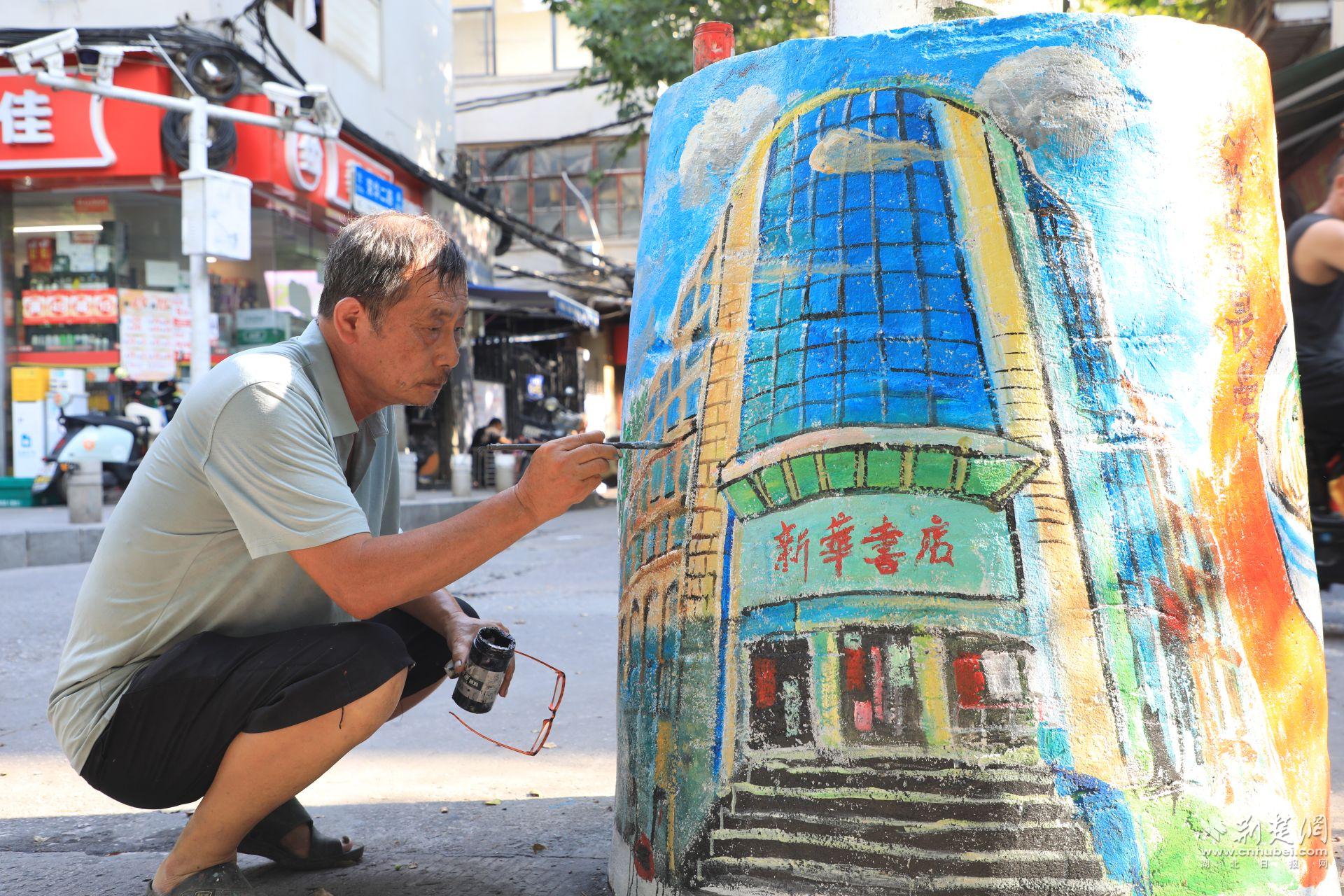 畢業(yè)于湖北美院雕塑專業(yè)的易小陽,年輕時就愛畫速寫。退休后,他決定把老街巷當畫布。半年時間,他義務(wù)繪制了120多處墻繪,總面積近500平方米。