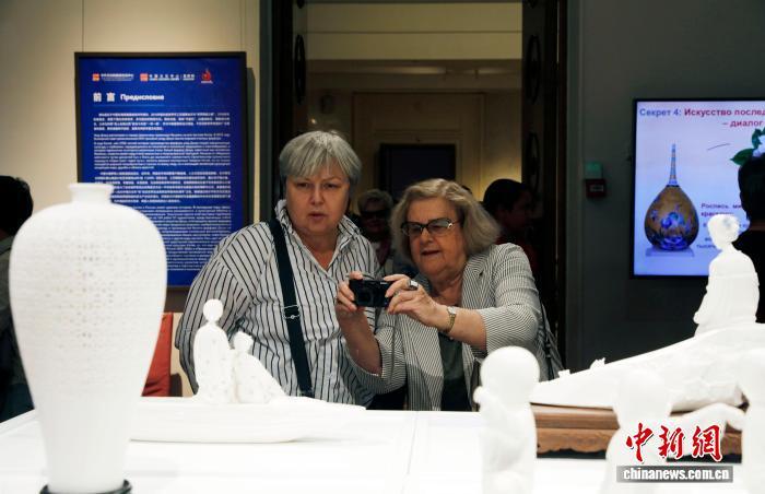 當(dāng)?shù)貢r(shí)間9月16日,“中國(guó)白·德化瓷”中國(guó)白瓷藝術(shù)展在莫斯科全俄裝飾藝術(shù)博物館開(kāi)幕。圖為觀眾參觀展覽。中新網(wǎng)記者 田冰 攝