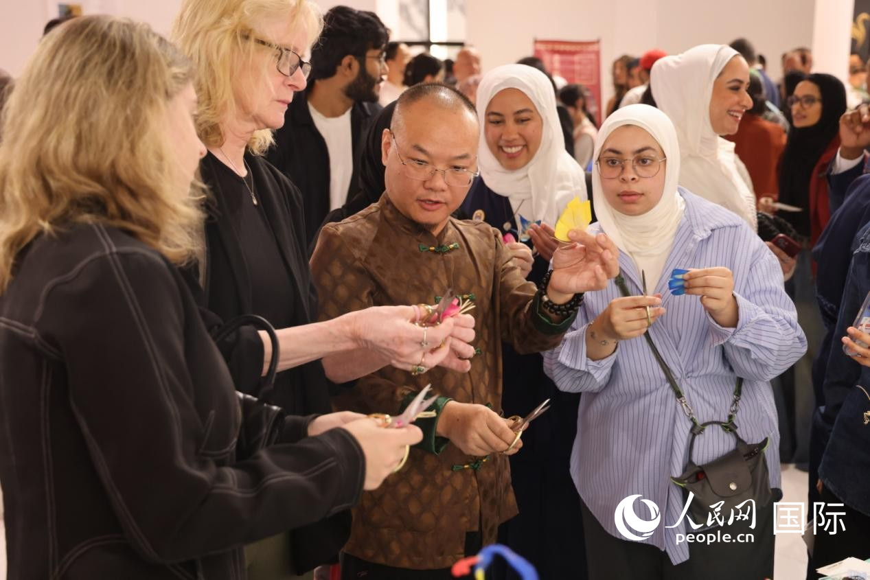 觀眾向中國師傅學(xué)習(xí)剪紙。人民網(wǎng)記者 張志文攝