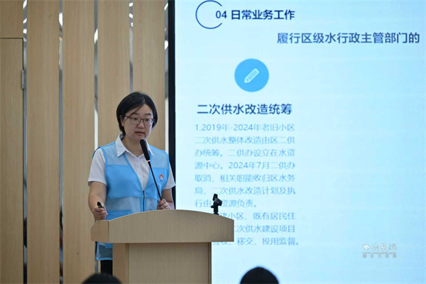 活動開場,武昌區(qū)水資源管理服務(wù)中心主任周妍圍繞《武昌區(qū)水務(wù)和湖泊局及水資源管理中心工作職責(zé)》展開解讀,清晰梳理水務(wù)部門在水資源調(diào)配、供水保障、設(shè)施維護(hù)等方面的職能;同時深入講解二次供水改造及修繕現(xiàn)行政策,從改造標(biāo)準(zhǔn)、申請流程到惠民福利逐一剖析,讓居民明晰這項(xiàng)民生舉措。