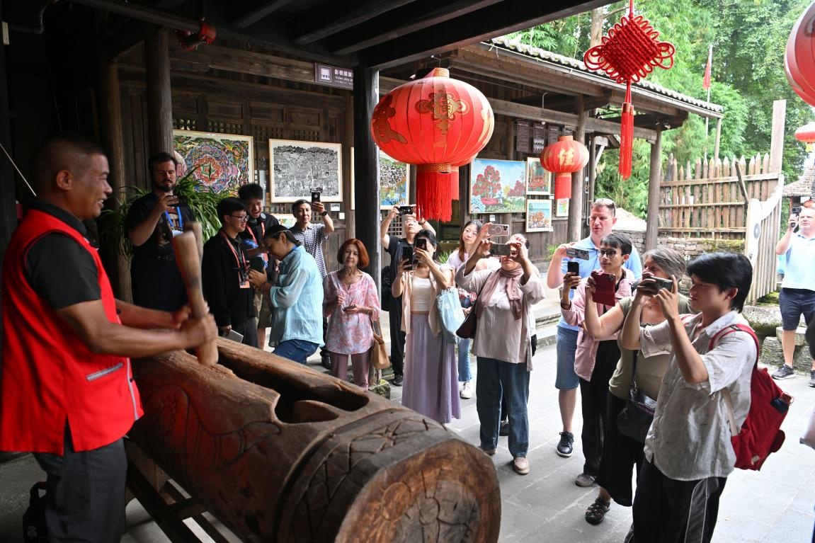 木杵砸進(jìn)石臼,蒸熟的米粒在一次次撞擊中從散粒變成團(tuán)塊,最終化作光滑綿韌的米團(tuán)。在云南騰沖司莫拉佤族村,《巴基斯坦觀察家報(bào)》董事長(zhǎng)兼總編輯費(fèi)薩爾·馬利克踏在結(jié)實(shí)的舂杵上體驗(yàn)制作大米粑粑,臉上掩不住好奇與欣喜。