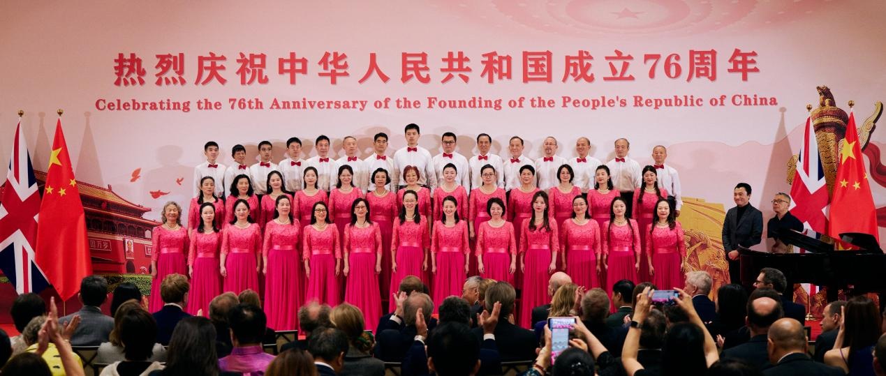 使館合唱團(tuán)以及倫敦華人愛(ài)樂(lè)合唱團(tuán)聯(lián)袂獻(xiàn)曲迎國(guó)慶。楊浩鵬攝