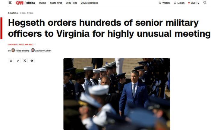 據(jù)CNN報道,數(shù)百名美國高級軍官將于9月30日與赫格塞思舉行會議,會議預(yù)計將在弗吉尼亞州的一個軍事基地舉行。