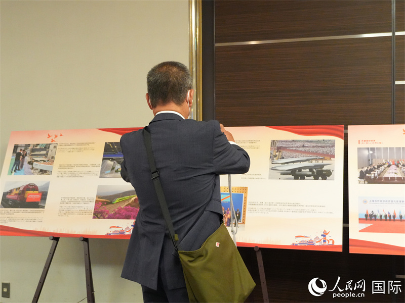 來賓觀看中國人民抗日戰(zhàn)爭、戰(zhàn)后中日關系恢復發(fā)展、中國式現(xiàn)代化及兩國重要政治、經(jīng)濟、文化、科技、人員交往活動圖片視頻,現(xiàn)場氣氛熱烈友好。