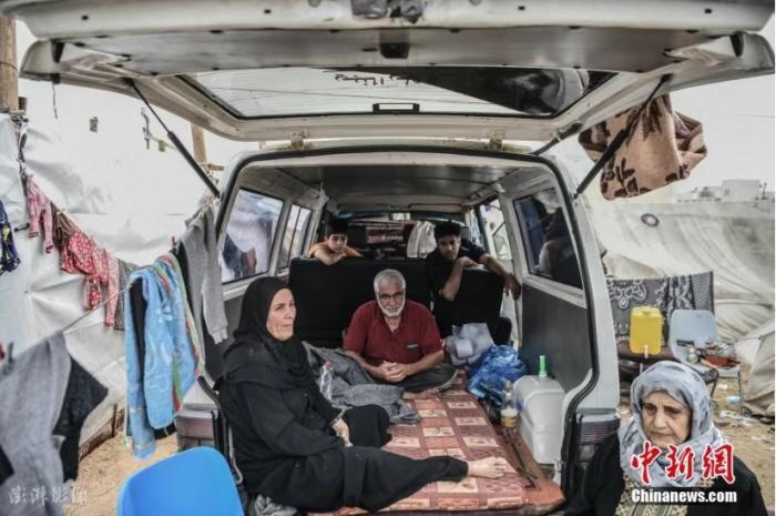 資料圖:加沙汗尤尼斯,巴以沖突持續(xù),當(dāng)?shù)卦庖陨幸u擊后,流離失所的當(dāng)?shù)孛癖娫诶щy條件下艱難求生。因家園被摧毀,他們選擇住在汽車內(nèi)或是搭起的臨時(shí)帳篷。