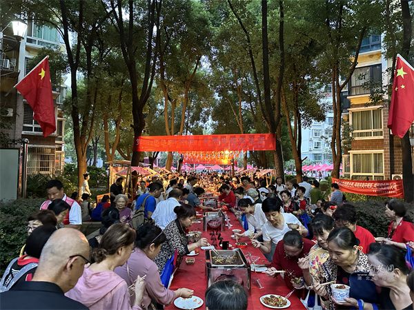 活動中,文藝表演與互動環(huán)節(jié)穿插進(jìn)行,帥鼓《歌唱祖國》、民樂《地道戰(zhàn)》、黃梅戲《再唱山歌給黨聽》輪番上演。當(dāng)54平方米的巨幅國旗緩緩展開,居民們揮舞小國旗齊唱贊歌,手中的紙飛機帶著美好祝愿飛向夜空,電子煙花綻放的瞬間,現(xiàn)場氣氛達(dá)到高潮。此外,三輪抽獎、“最受歡迎菜品”評選等環(huán)節(jié),更讓活動充滿驚喜與趣味。