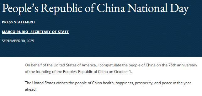中新網(wǎng)10月1日電 根據(jù)美國國務(wù)院網(wǎng)站當(dāng)?shù)貢r間9月30日消息,美國國務(wù)卿魯比奧發(fā)表簡短聲明:我謹(jǐn)代表美利堅合眾國,就中華人民共和國成立76周年表示祝賀。