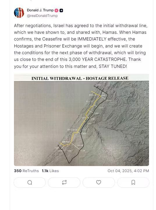 當(dāng)?shù)貢r(shí)間10月4日,美國總統(tǒng)特朗普在其社交平臺“真實(shí)社交”發(fā)文稱,以色列已同意加沙地帶初步撤軍路線,并將相關(guān)方案與巴勒斯坦伊斯蘭抵抗運(yùn)動(哈馬斯)共享。一旦哈馬斯確認(rèn),?;饘⒘⒓瓷?/strong>,被扣押人員與囚犯交換隨即啟動。