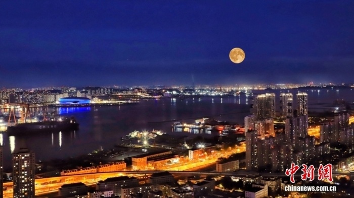 遼寧大連,中秋節(jié)一輪圓月從大連梭魚(yú)灣東方海岸線升起。