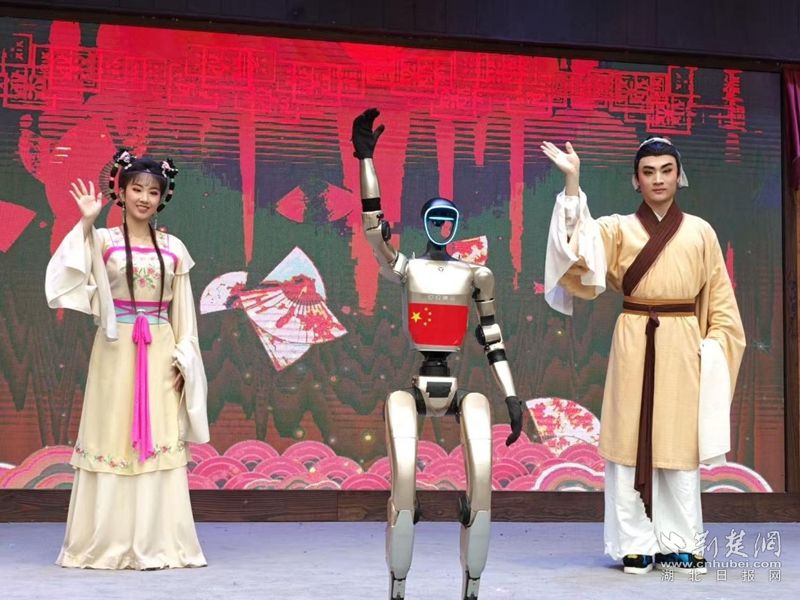 荊楚網(wǎng)(湖北日報(bào)網(wǎng))訊(通訊員王晶、費(fèi)留燦)國慶中秋假期,在黃梅縣東山問梅村,當(dāng)黃梅戲《女駙馬》的經(jīng)典唱段響起,機(jī)器人踩著婉轉(zhuǎn)唱腔靈活擺臂、轉(zhuǎn)身,復(fù)刻戲曲身段的韻味;戲腔未落,身著傳統(tǒng)獅頭裝扮的機(jī)器狗躍至臺前,跟著鼓點(diǎn)騰躍撲閃,鬃毛翻飛間盡顯靈動(dòng),引得游客紛紛舉手機(jī)拍攝,鏡頭緊追這些“特殊演員”。