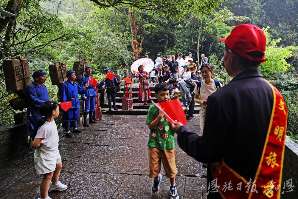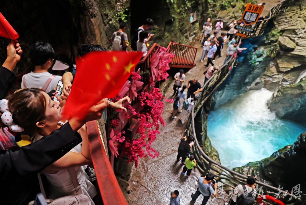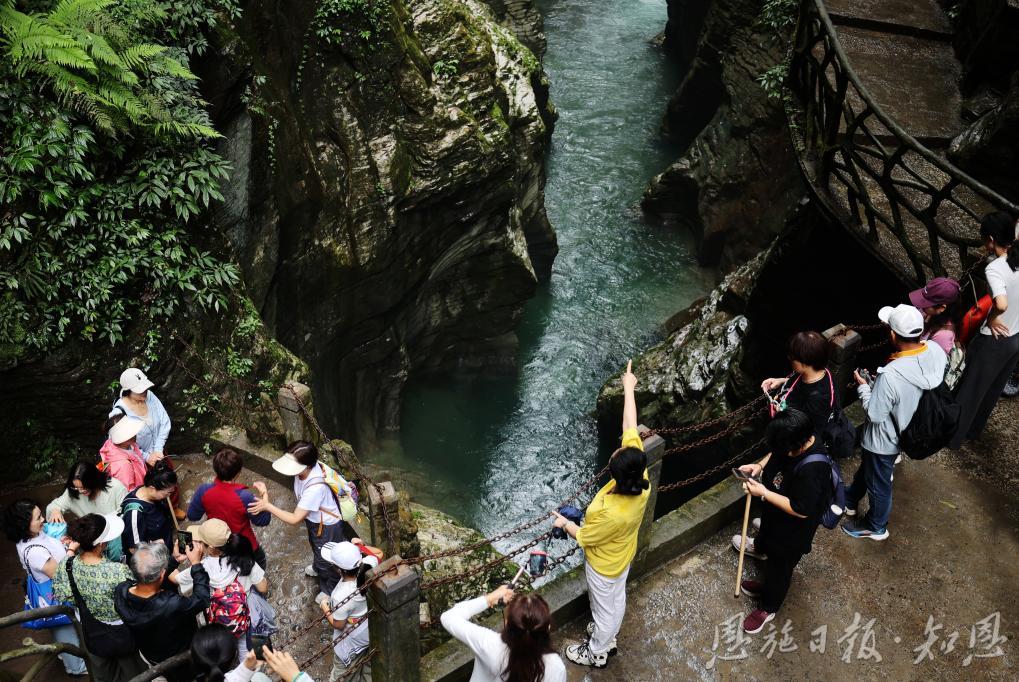 峽谷間,溪流潺潺,奇峰競秀,游客們或駐足凝望,或舉機留影,將大自然的鬼斧神工珍藏于鏡頭之中。孩子們在親水步道上歡笑嬉戲,大人們在觀景平臺上悠然小憩,處處洋溢著節(jié)日的歡愉。