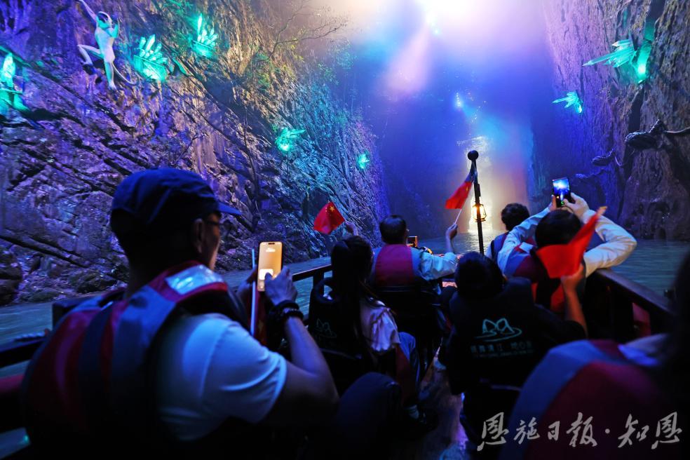 “地心奇航”作為景區(qū)全新推出的峽谷Npc王牌項目,成為這個假期恩施旅游當之無愧的人氣明星,尤其受到家庭游客的青睞。游客們乘船緩緩潛入“中國紅”世界里的地心秘境,地心先知、鵲橋飛歌、踏浪迷航、時空裂縫、冰河時代、地心熔巖、巨獸之巢、地心烙印迷境中,沿途石幔如瀑、穹頂若星,情景交融,在清澈的地下河上享受“水陸并行”的獨特視角。