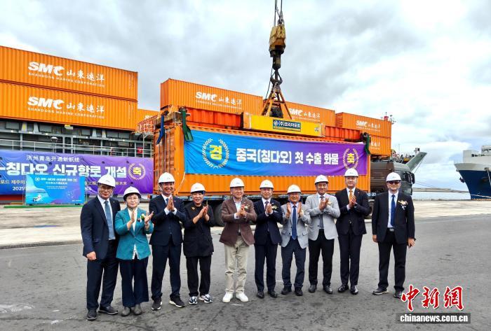 慶?;顒忧?,雙方代表共赴碼頭現(xiàn)場參加船舶入港儀式,濟州道政務副知事金愛淑向中方首航船長贈送花環(huán)。大家熱烈鼓掌歡迎“濟州首批進口貨物”集裝箱卸貨,并在“首批出口中國(青島)貨物”集裝箱前合影留念,共同慶祝這一歷史性時刻,祝愿雙方合作更加密切、友誼之樹常青。(完)