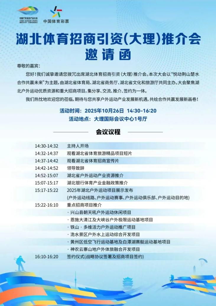 為貫徹體育產(chǎn)業(yè)高質(zhì)量發(fā)展部署,釋放湖北戶外運動資源優(yōu)勢,搭建跨區(qū)域合作平臺,由湖北省體育局、湖北省商務廳、湖北省文化和旅游廳聯(lián)合主辦的2025中國戶外運動產(chǎn)業(yè)大會湖北專場推介活動,將于10月26日14:30-16:20在云南大理國際會議中心1號廳重磅舉行。