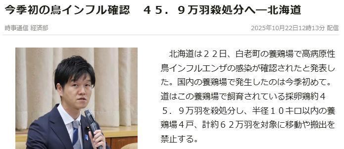 據(jù)報道,北海道政府決定對該養(yǎng)雞場飼養(yǎng)的約45.9萬只蛋雞實施撲殺,并禁止半徑10公里內的4家養(yǎng)雞場(總計約62萬只)移動或外運畜禽。