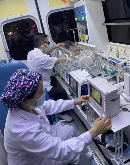 轉(zhuǎn)運團隊由一名新生兒科副主任醫(yī)師、一名新生兒科主管護師、一名急診科主管護師和一名資深司機組成。在短短十分鐘內(nèi),團隊迅速集結(jié)完畢,并配備了齊全的“移動ICU”設(shè)備,包括新生兒轉(zhuǎn)運暖箱、便攜式呼吸機、多參數(shù)監(jiān)護儀、輸液泵及急救藥品等。其中,新生兒轉(zhuǎn)運暖箱堪稱寶寶途中的“生命堡壘”,其恒溫、恒濕、防震設(shè)計,能夠全面應(yīng)對路途中的各種挑戰(zhàn),為患兒提供最安全的保護。