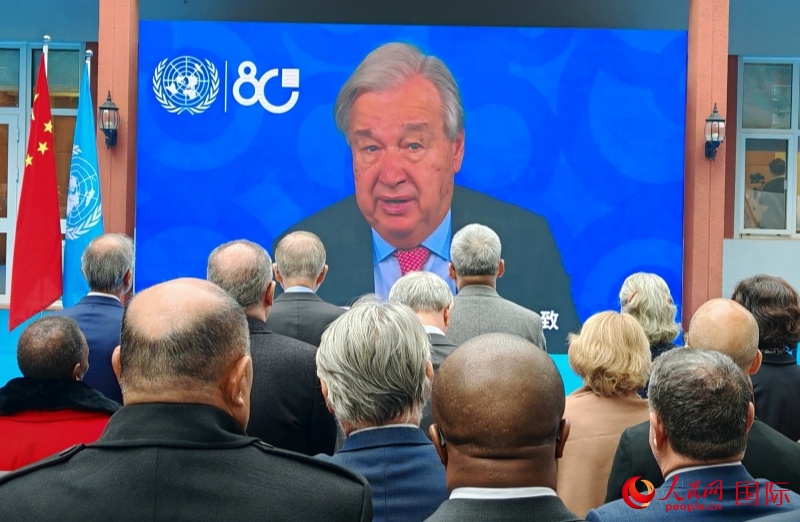 聯(lián)合國秘書長古特雷斯發(fā)來聯(lián)合國日致辭視頻。人民網(wǎng)記者 李琰攝