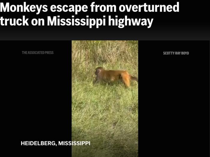 中新網(wǎng)10月29日電 據(jù)美聯(lián)社報道,當(dāng)?shù)貢r間28日,美國密西西比州一條高速公路上,一輛運送猴子的卡車發(fā)生側(cè)翻,導(dǎo)致被運輸?shù)暮镒犹用摗?/p>