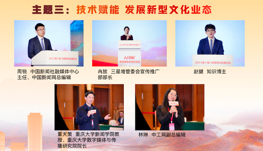 在“技術(shù)賦能 發(fā)展新型文化業(yè)態(tài)”主題研討環(huán)節(jié),中國(guó)新聞社融媒體中心主任、中國(guó)新聞網(wǎng)總編輯周銳,三星堆管委會(huì)宣傳推廣部部長(zhǎng)冉放,知識(shí)博主趙健,分別就技術(shù)賦能中華文化“破圈”出海、三星堆文化傳播數(shù)智實(shí)踐、短視頻文化傳播等方面的經(jīng)驗(yàn)成果進(jìn)行了精彩展示。重慶大學(xué)新聞學(xué)院教授、重慶大學(xué)數(shù)字媒體與傳播研究院院長(zhǎng)董天策,中工網(wǎng)副總編輯林琳作為互動(dòng)嘉賓進(jìn)行了點(diǎn)評(píng),期待主流媒體發(fā)揮傳播實(shí)踐智慧,在內(nèi)容、技術(shù)和社會(huì)責(zé)任之間找到平衡,鑄造中華文化新輝煌。